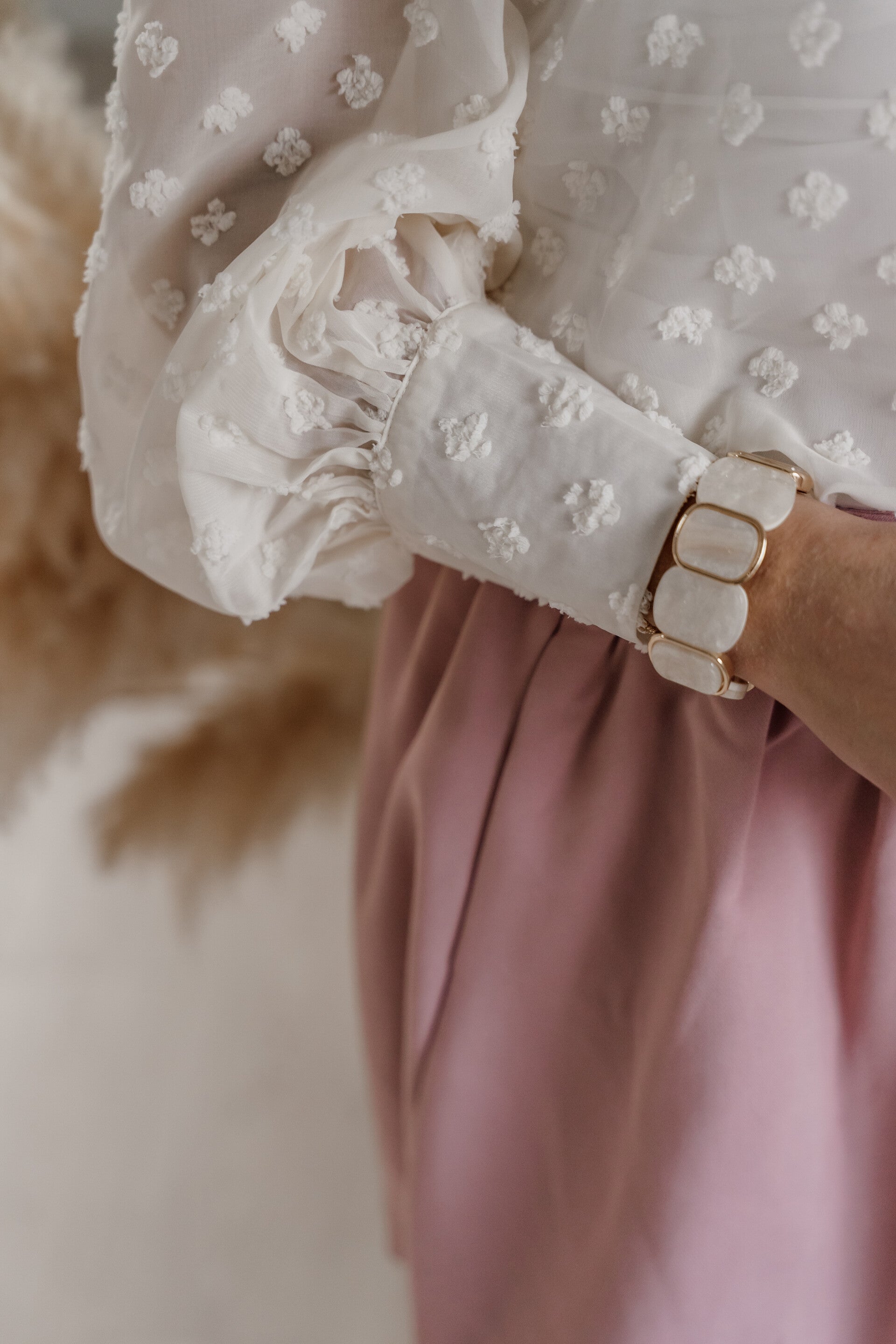 Deze elegante blouse is een veelzijdige toevoeging aan je garderobe. De lichte, semi-transparante stof met ingeweven bloempatroon geeft een zachte en vrouwelijke uitstraling. De pofmouwen en klassieke kraag zorgen voor een tijdloze, romantische look.