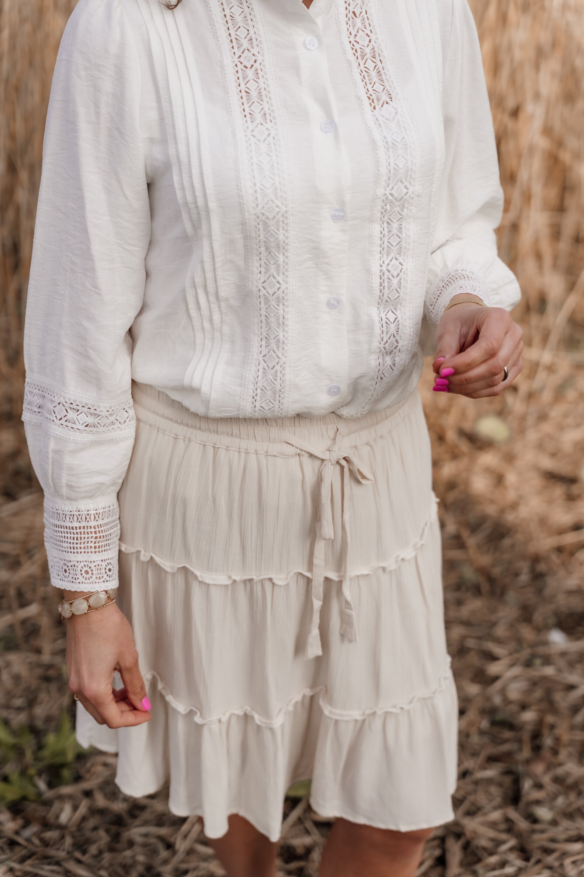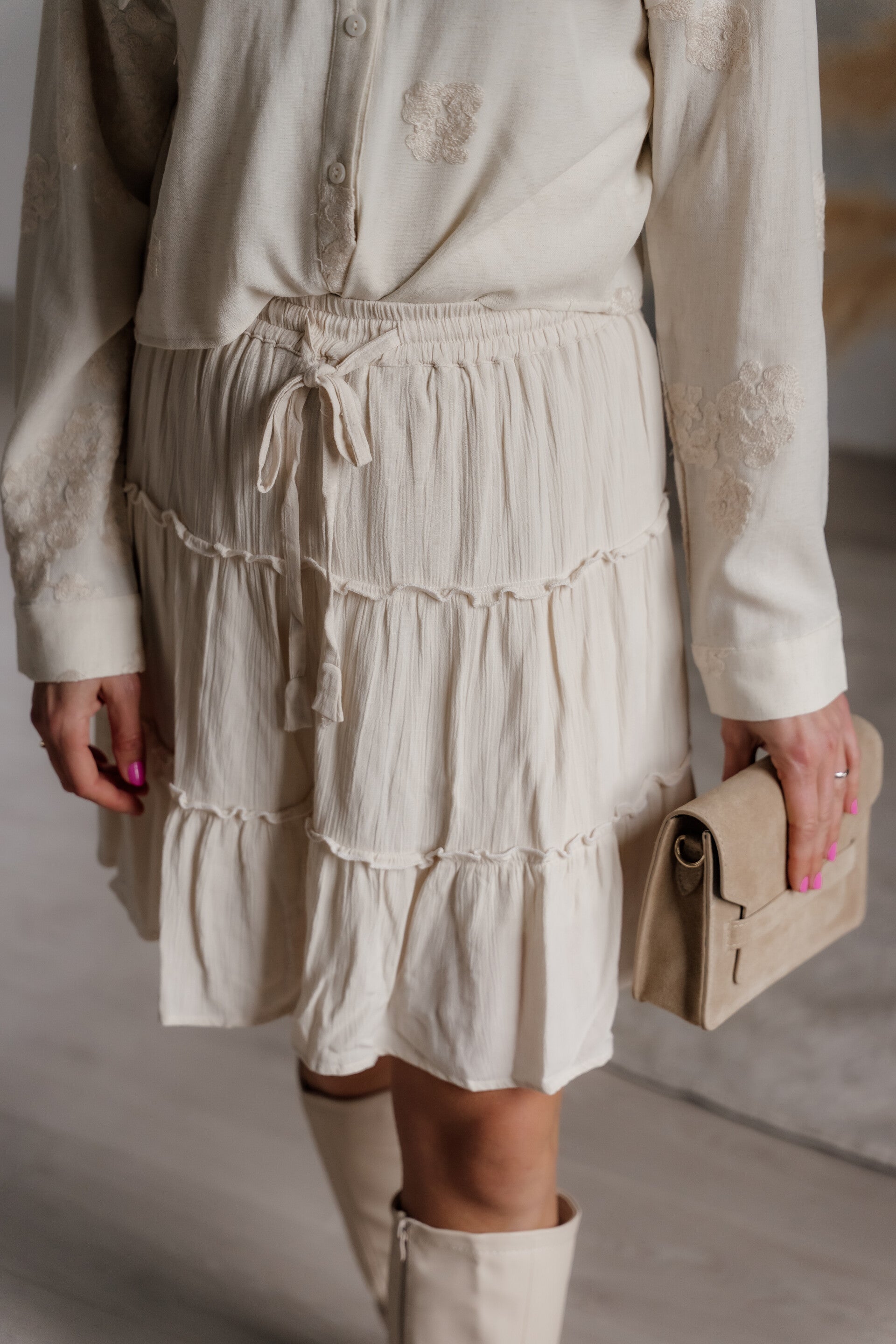 Dit speelse en vrouwelijke rokje is een echte musthave voor ieder seizoen. De luchtige, fijn geplooide stof geeft het rokje een elegante beweging, terwijl de subtiele ruffle-lagen zorgen voor een charmante, romantische uitstraling. Het ontwerp valt soepel en creëert een mooi silhouet zonder te strak te zitten, en is voorzien van een onderrok voor extra comfort.