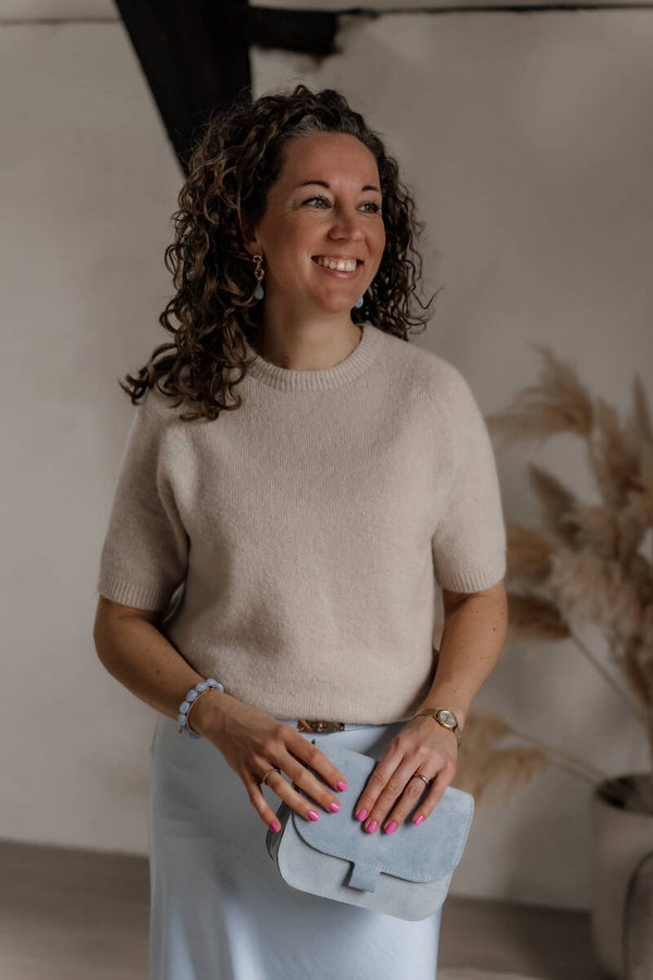 Deze bestseller basic is nu verkrijgbaar in een prachtige beige tint die werkelijk overal mee te combineren is. De top heeft een ronde hals en korte mouwen en is geschikt om te dragen t/m maat L. Dankzij het gebruik van baby alpaca wol voelt de trui heerlijk zacht aan en heeft deze een subtiel wollig effect, zonder te kriebelen.