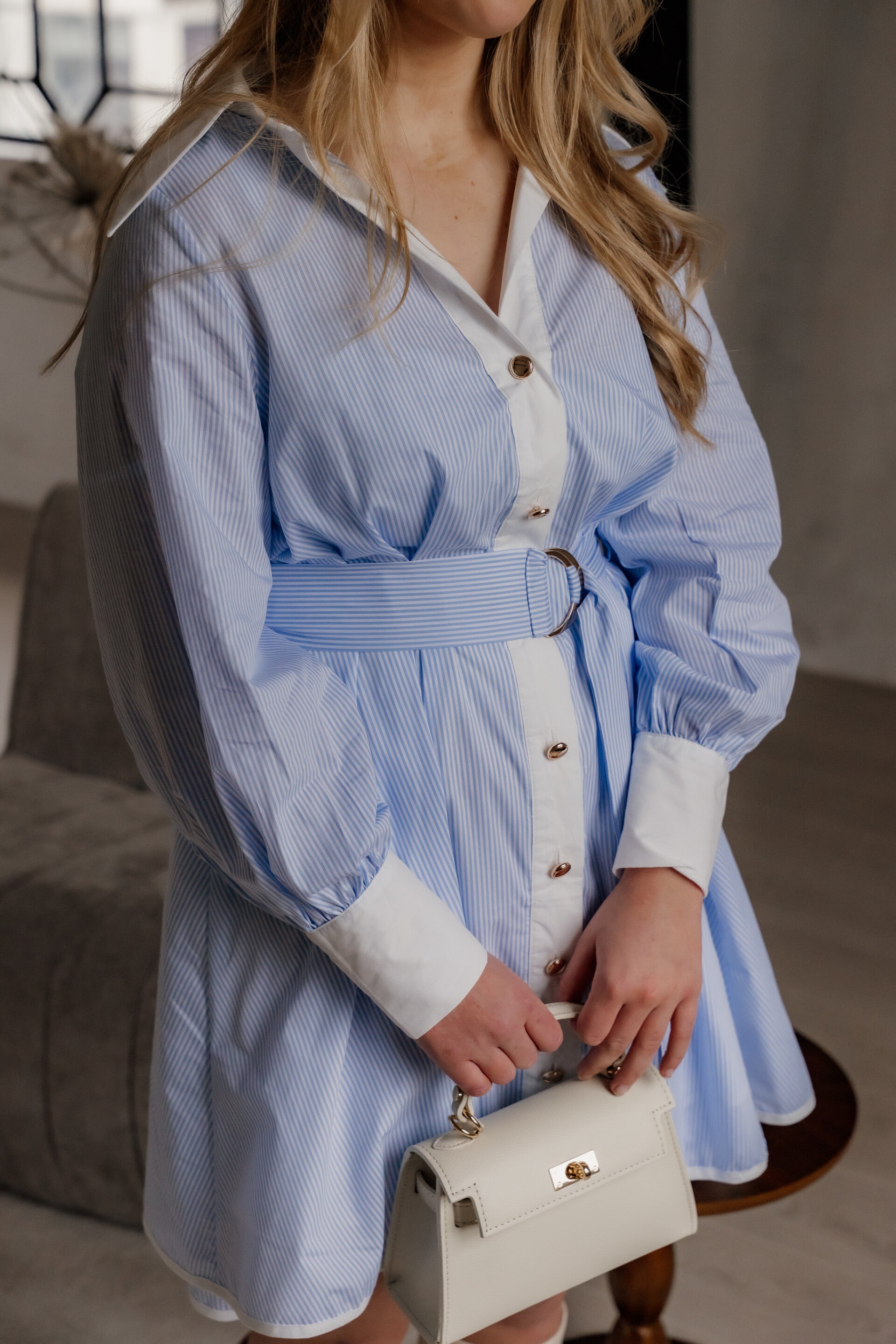 Deze klassieke en stijlvolle jurk is een echte tijdloze musthave. De subtiele goudkleurige knopen geven een luxe uitstraling, terwijl de contrasterende kraag en manchetten zorgen voor een elegante touch. De jurk valt op maat en heeft een losvallend model dat niet aansluit in de taille, maar met de bijpassende ceintuur mooi getailleerd kan worden voor een vrouwelijk silhouet. Het rokdeel is gevoerd met een comfortabele katoenen voering, waardoor de jurk prettig draagt en niet doorschijnt.