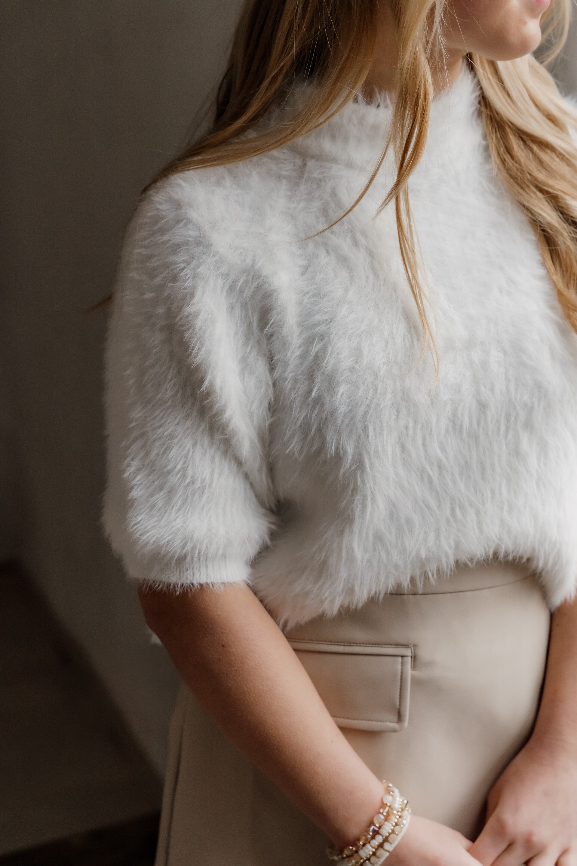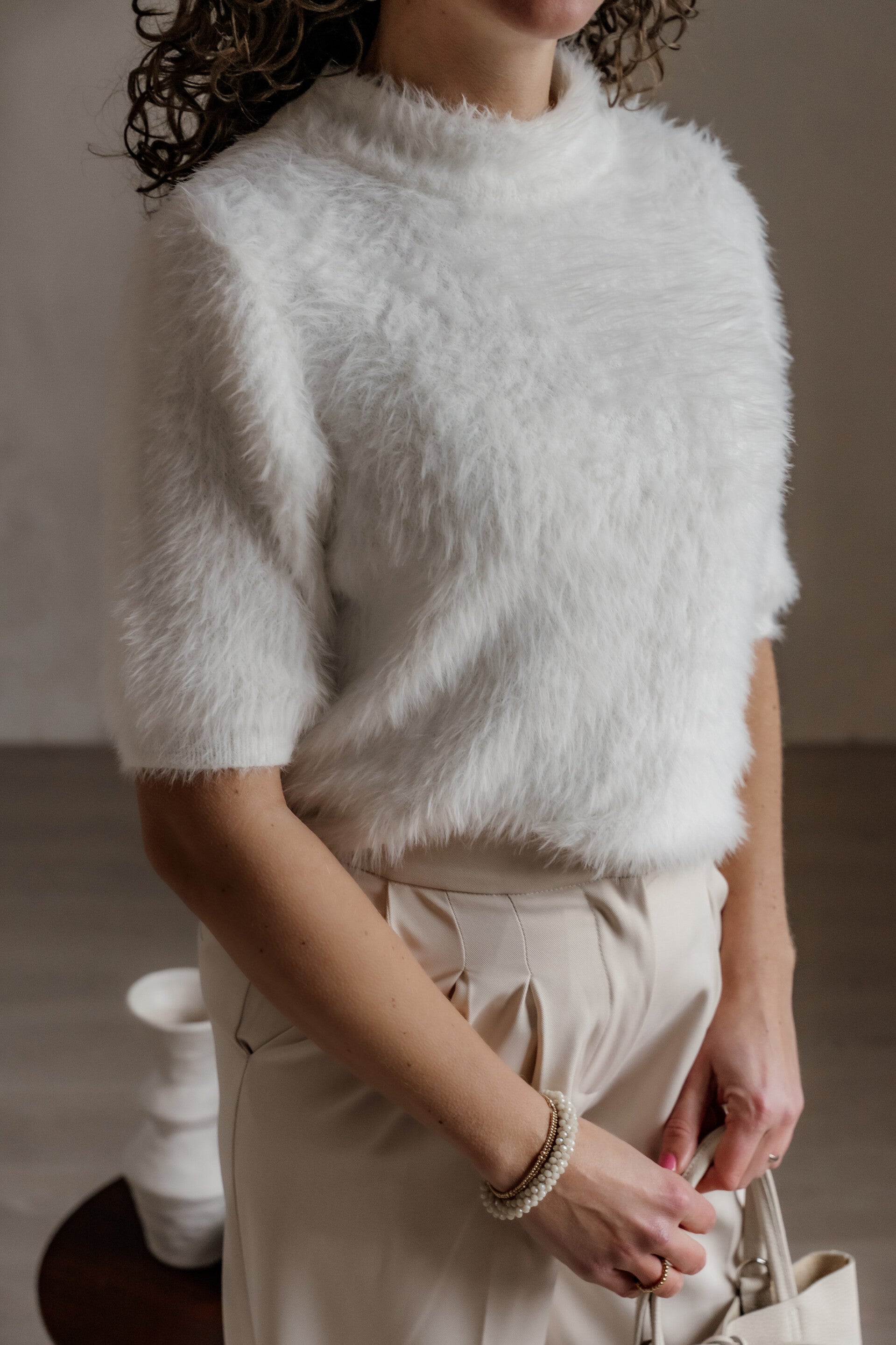 Deze off white fluffy top is een echte musthave voor een cozy en stijlvolle look. De zachte, hoogwaardige kwaliteit voelt heerlijk comfortabel aan op de huid en geeft je outfit direct een luxe uitstraling.