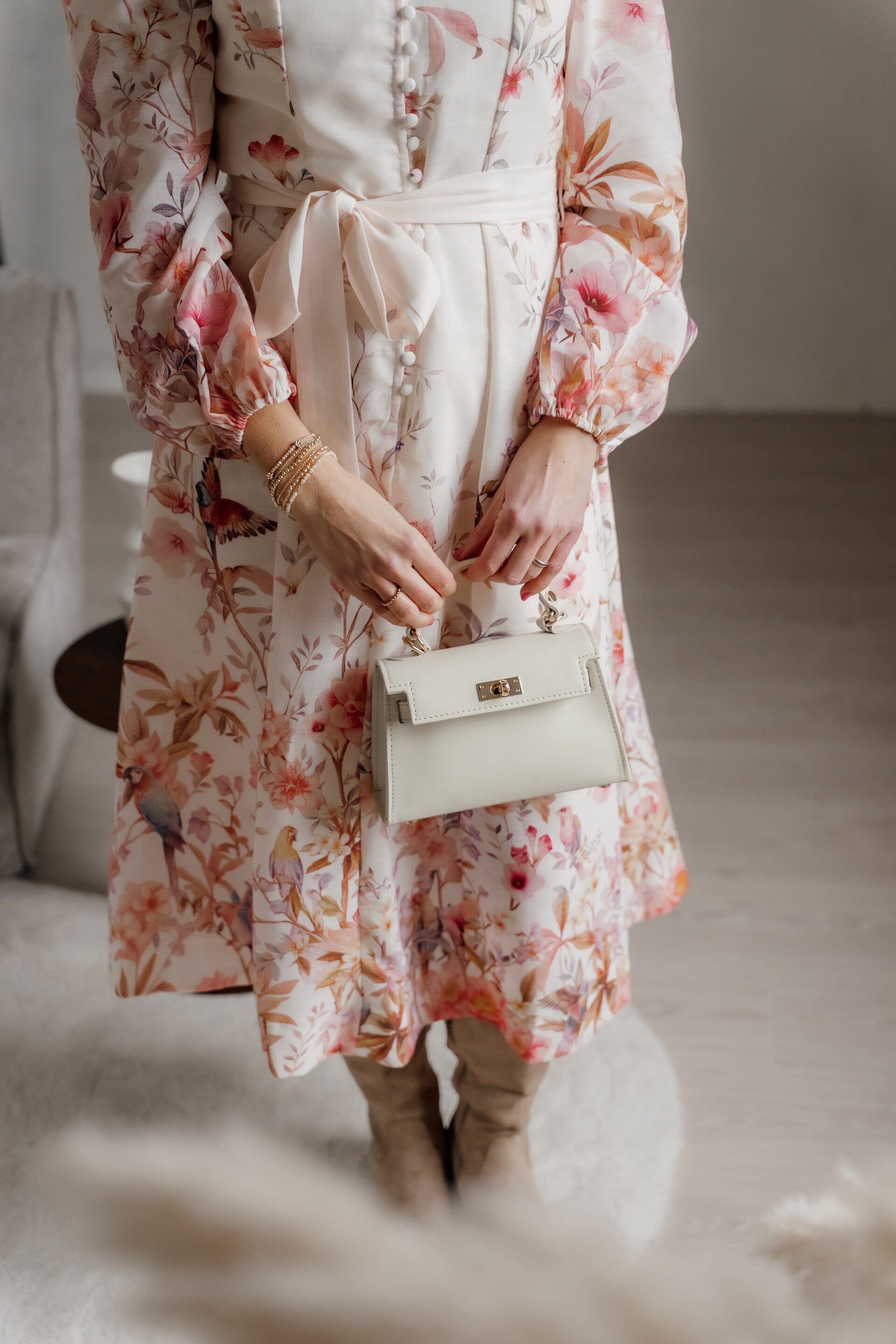 Deze elegante lange jurk met bloemen- en vlinderprint straalt pure romantiek uit. De zachte tinten en sierlijke knoopsluiting geven een verfijnde uitstraling. Dankzij de flatterende A-lijn pasvorm – aangesloten boven en soepel uitlopend vanaf de taille – creëer je een vrouwelijk silhouet. Met het bijpassende ceintuur accentueer je eenvoudig je taille.