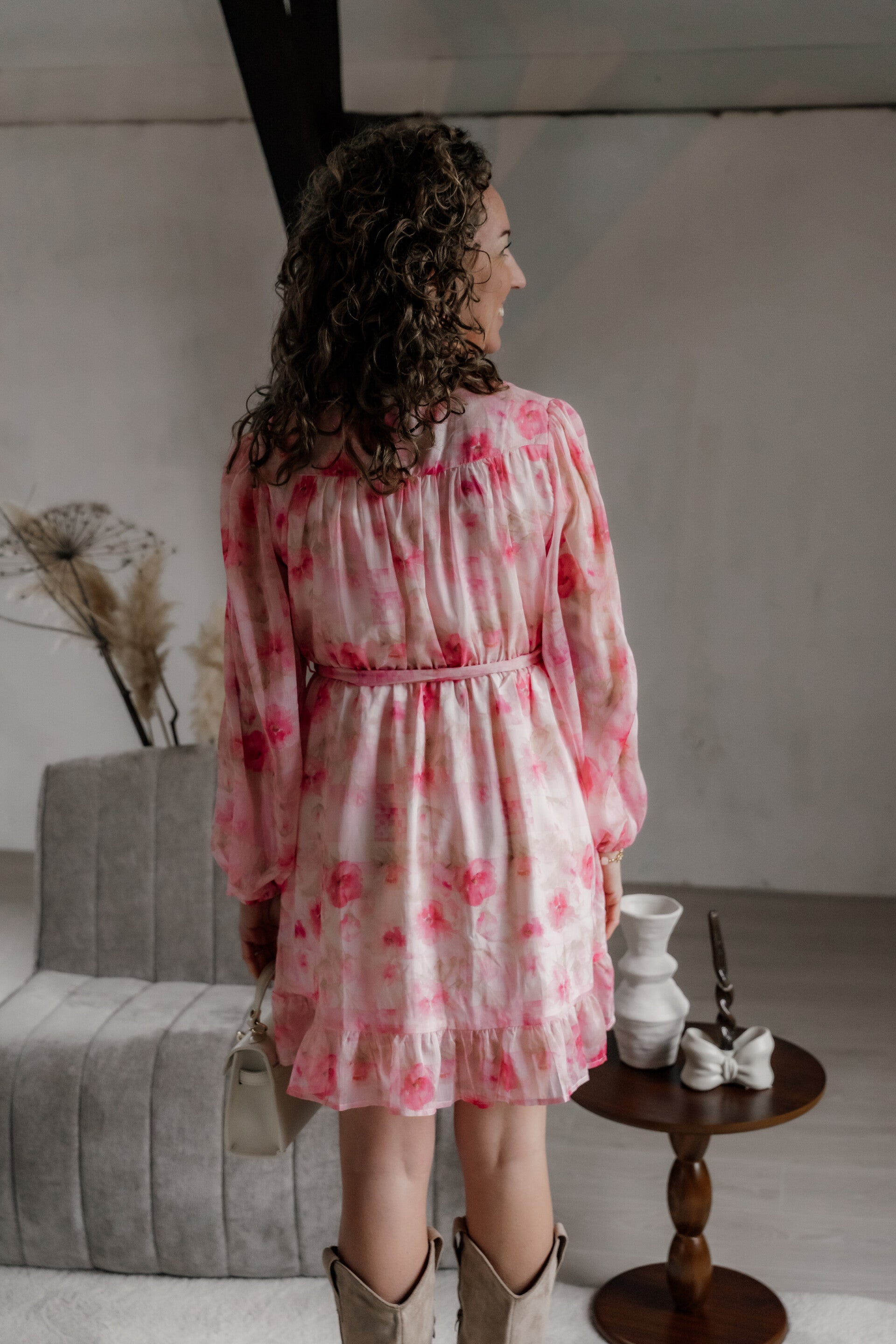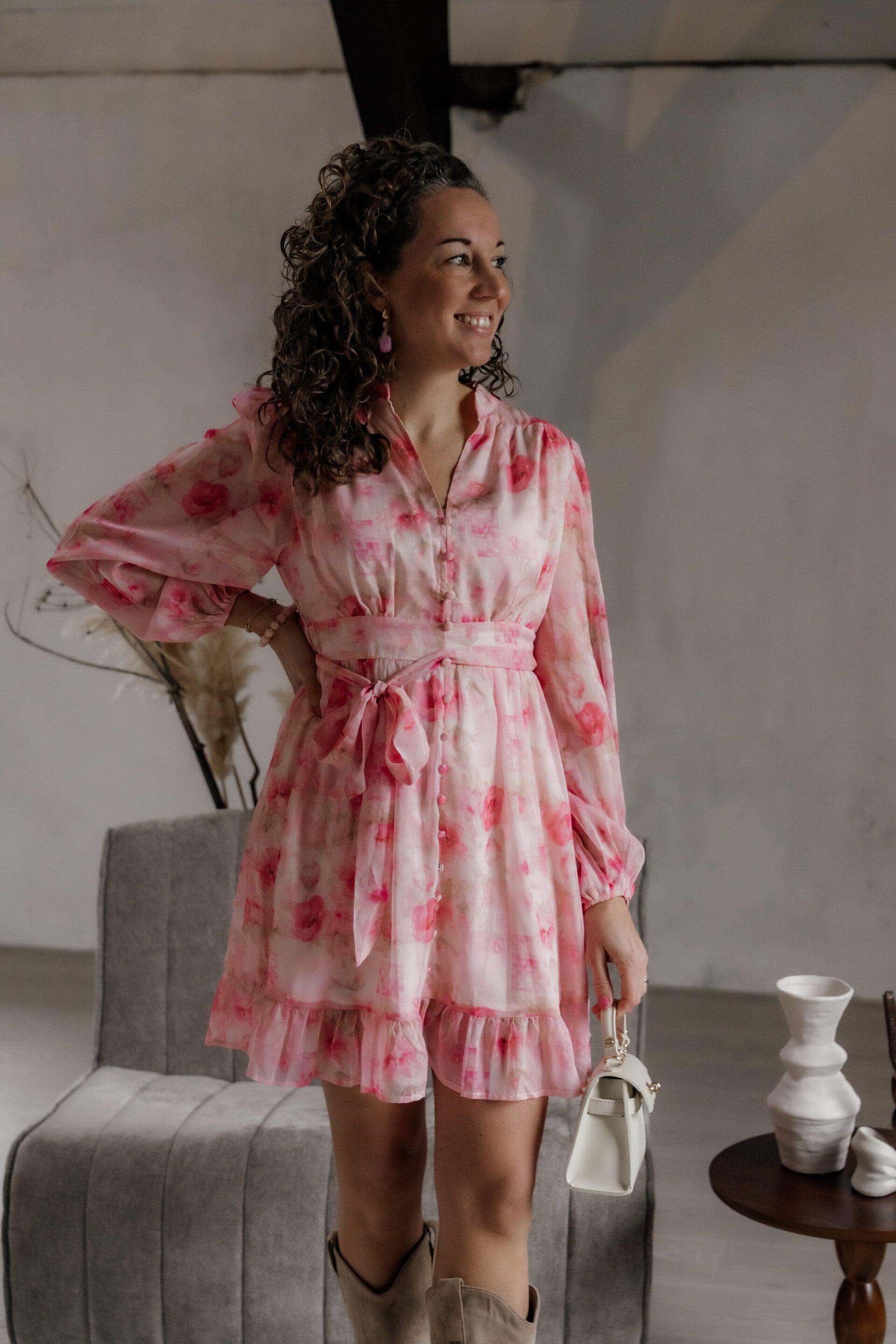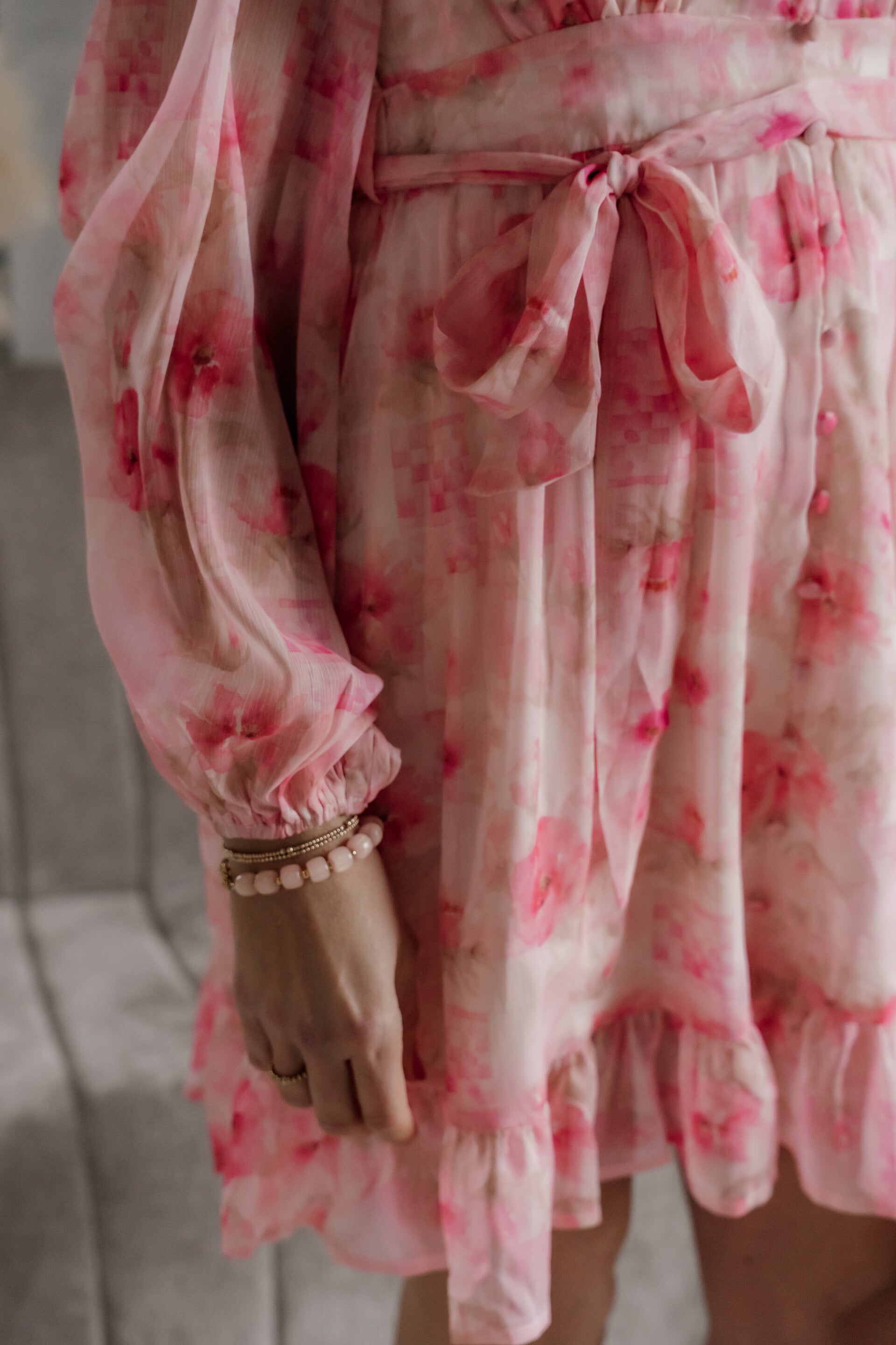Deze romantische korte roze jurk met verfijnde bloemenprint is perfect voor het voorjaar en de zomer. De luchtige stof valt soepel en zorgt voor een elegante, vrouwelijke uitstraling. Dankzij de V-hals met knoopsluiting en de lange mouwen met elastische manchetten heeft de jurk een stijlvolle en comfortabele pasvorm.