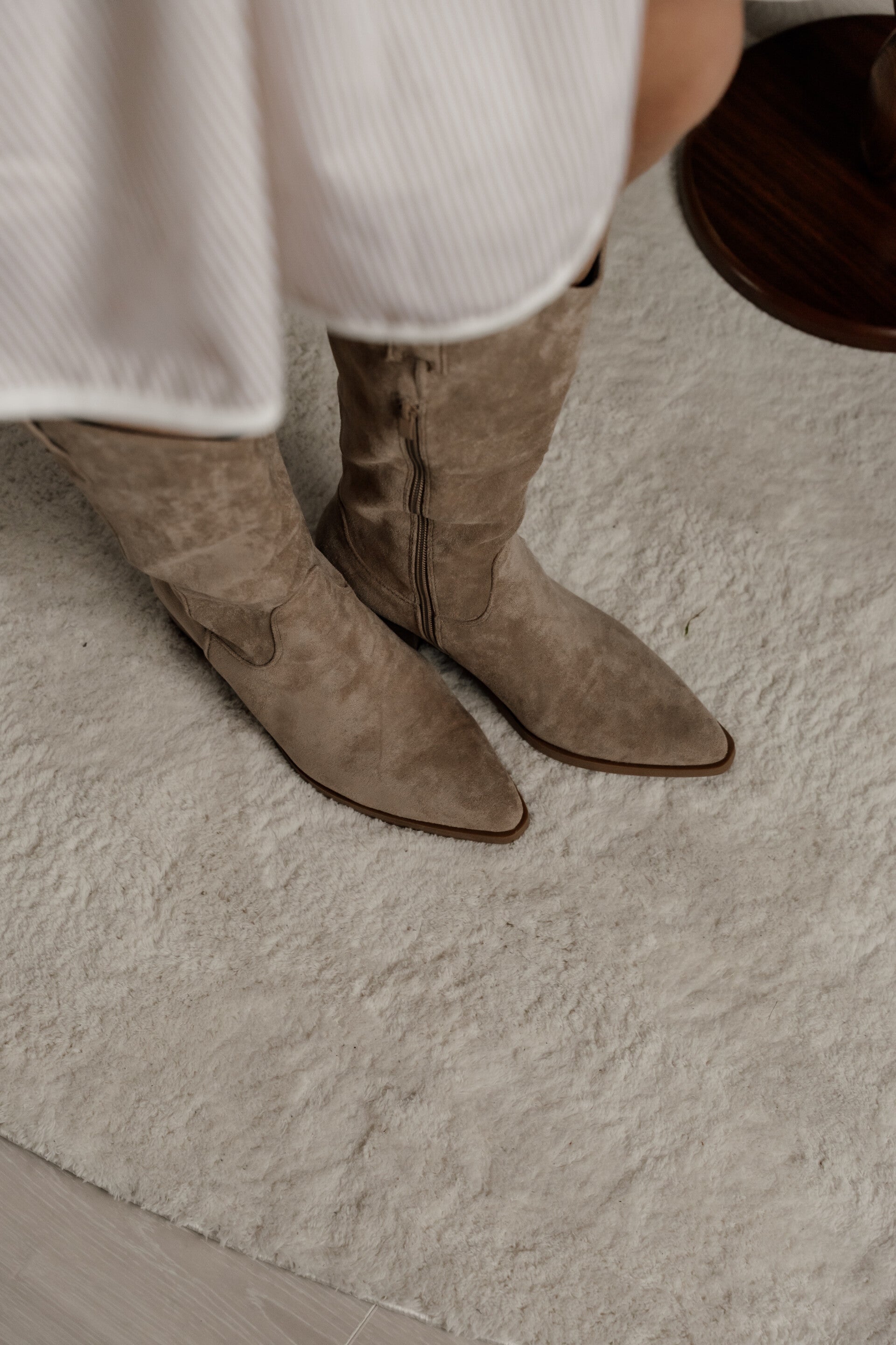 Deze licht taupe kleurige laarzen in suède look zijn een tijdloze toevoeging aan je garderobe. Het elegante, minimalistische model met subtiele blokhak zorgt voor een vrouwelijke en stijlvolle uitstraling. Dankzij de ritssluiting aan de binnenzijde trek je ze gemakkelijk aan en uit.