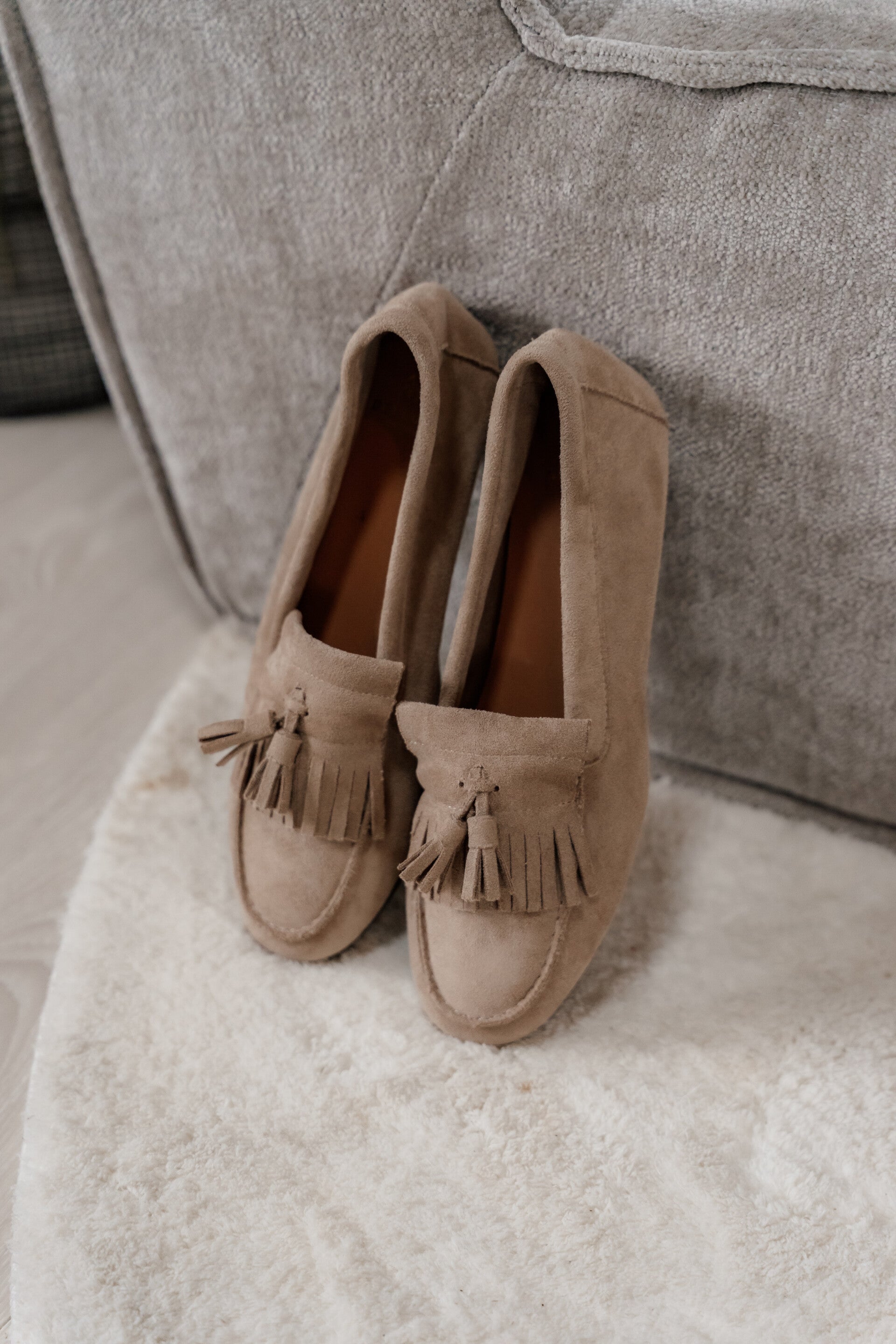 Deze stijlvolle loafers in een zachte taupekleur zijn gemaakt van suède en afgewerkt met verfijnde franjes en een subtiel kwastdetail. Het klassieke model krijgt hierdoor een speelse, vrouwelijke touch.