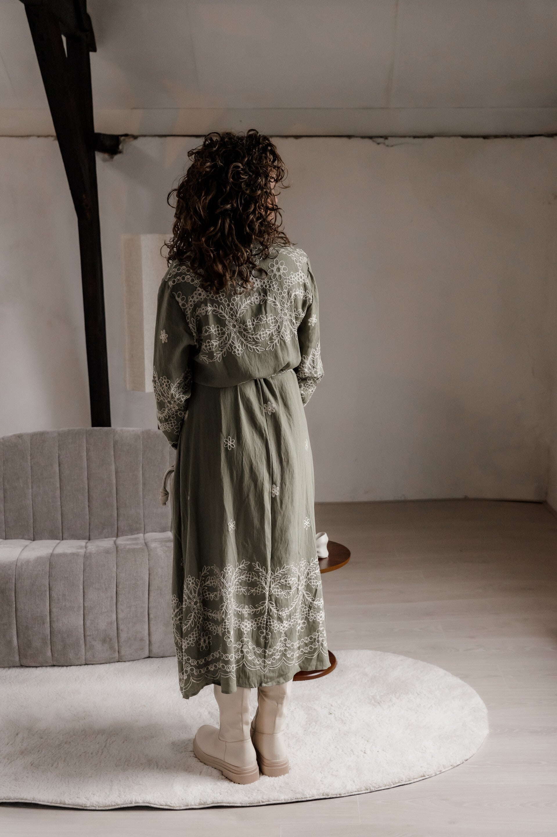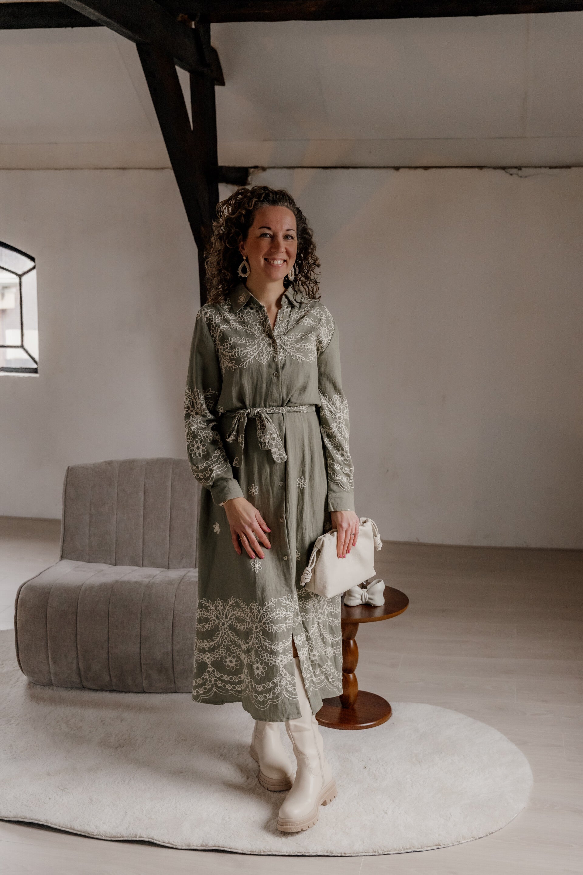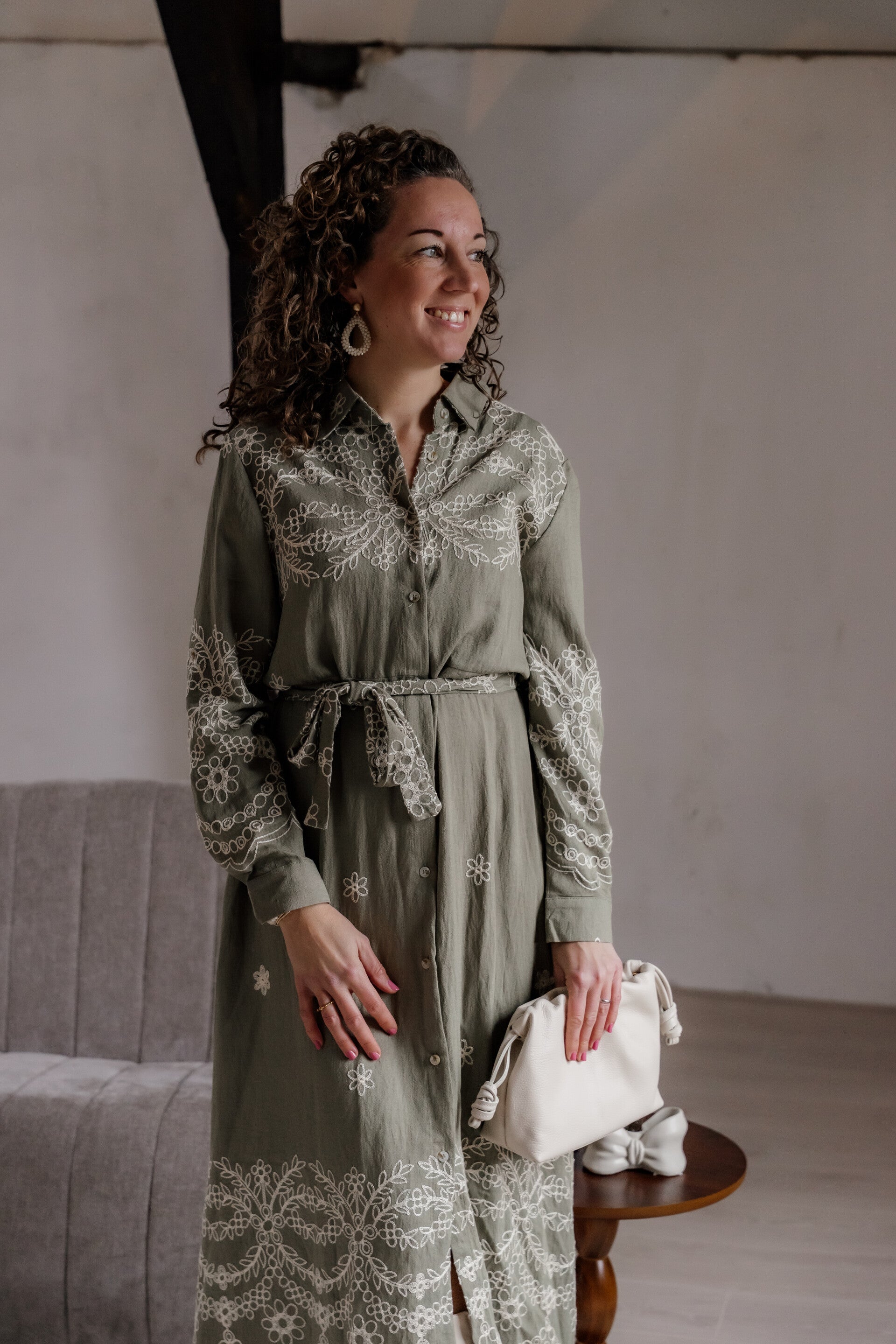 Deze saliegroene midi jurk straalt elegantie en comfort uit. Het verfijnde witte borduurwerk geeft een romantische touch, terwijl de doorknoopsluiting en bijpassende strikceintuur zorgen voor een vrouwelijke pasvorm.