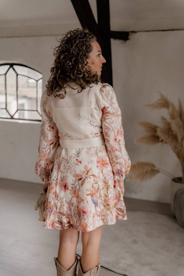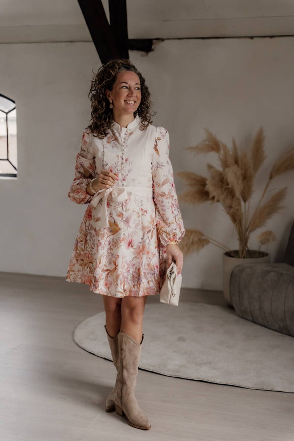 Deze elegante lange jurk met bloemen- en vlinderprint straalt pure romantiek uit. De zachte tinten en sierlijke knoopsluiting geven een verfijnde uitstraling. Dankzij de flatterende A-lijn pasvorm – aangesloten boven en soepel uitlopend vanaf de taille – creëer je een vrouwelijk silhouet. Met het bijpassende ceintuur accentueer je eenvoudig je taille.