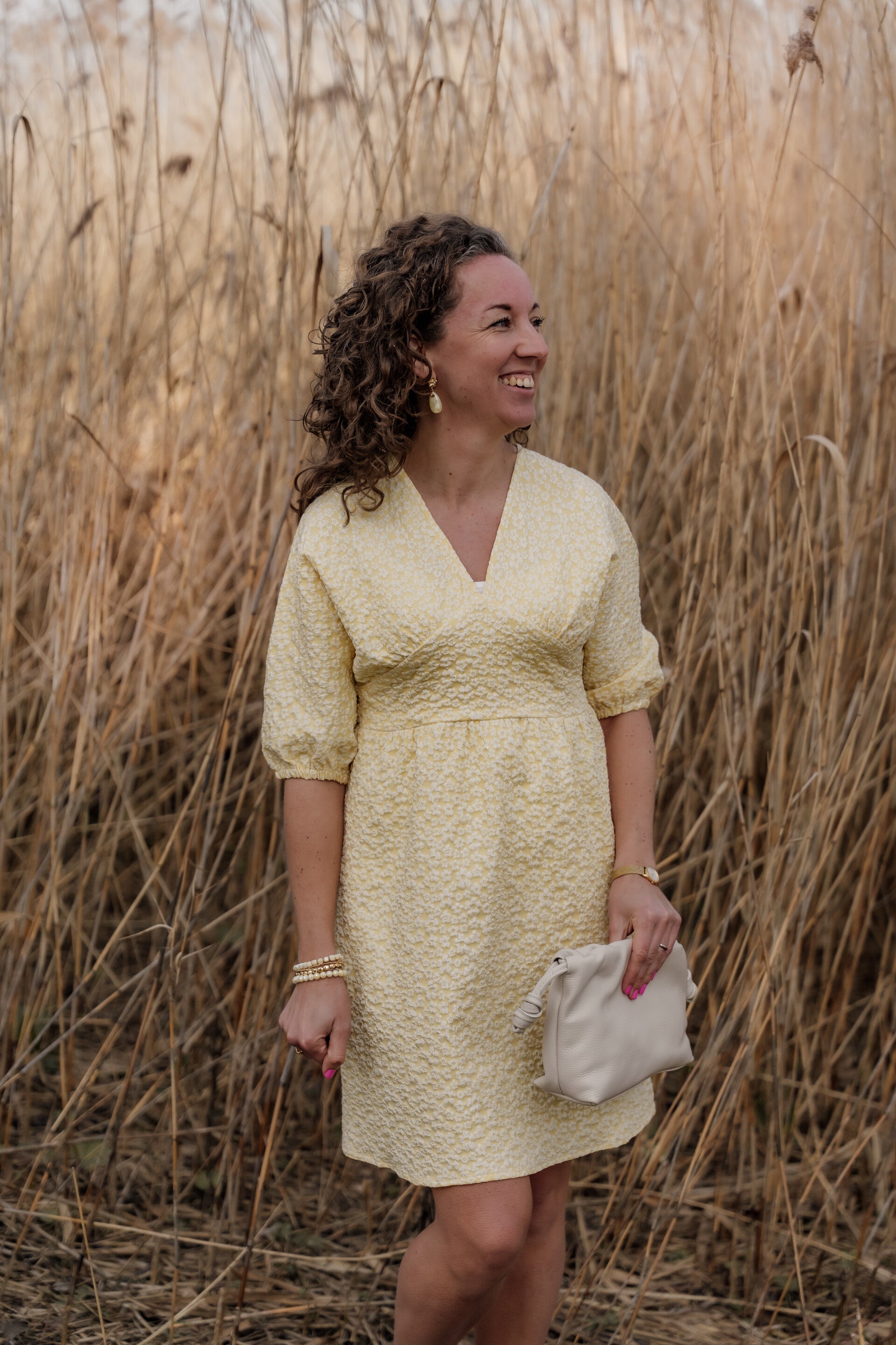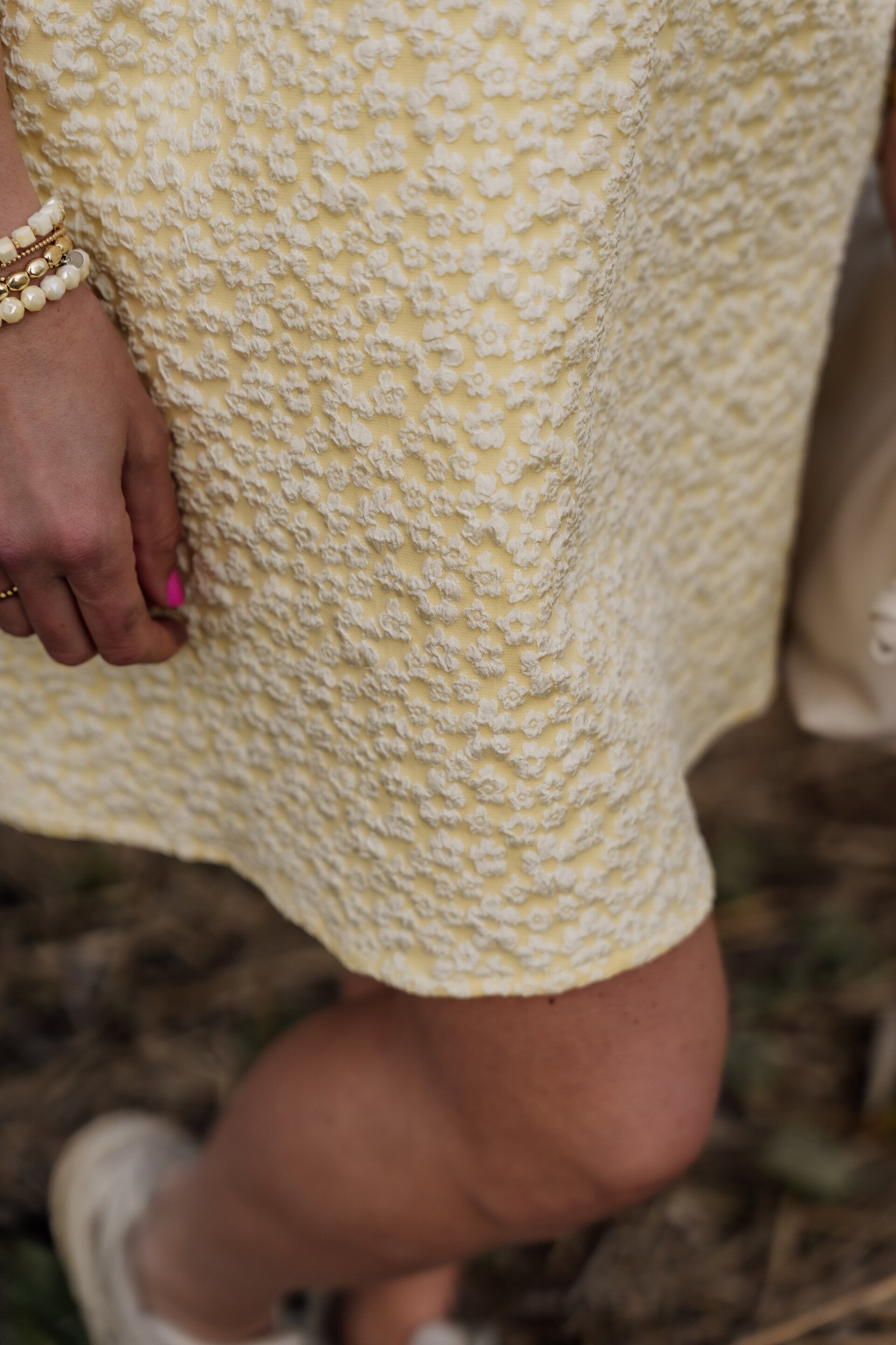 Deze elegante lichtgele jurk met bloemmotief heeft een vrouwelijke V-hals, licht gepofte mouwen en een subtiel getailleerde pasvorm. De mooie structuur in de stof geeft de jurk een stijlvolle en unieke uitstraling. Perfect voor een zonnige dag, een feestje of bruiloft.