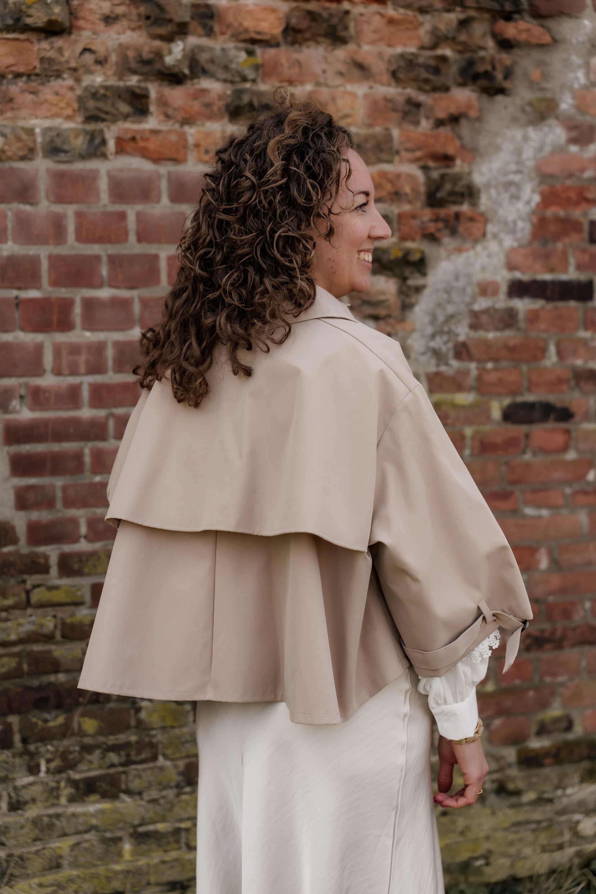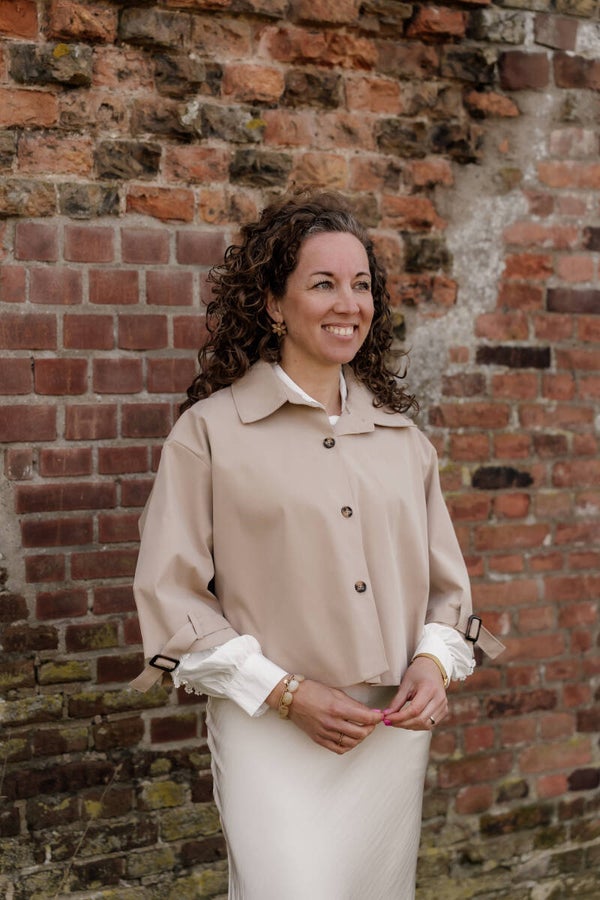 Stijlvolle korte trenchcoat in een mooie beige kleur. Dit dunne, ongevoerde jasje heeft een moderne cropped pasvorm met 3/4 mouwen en een knoopsluiting aan de voorzijde. De mouwen zijn afgewerkt met een subtiel banddetail voor een speelse en trendy touch.