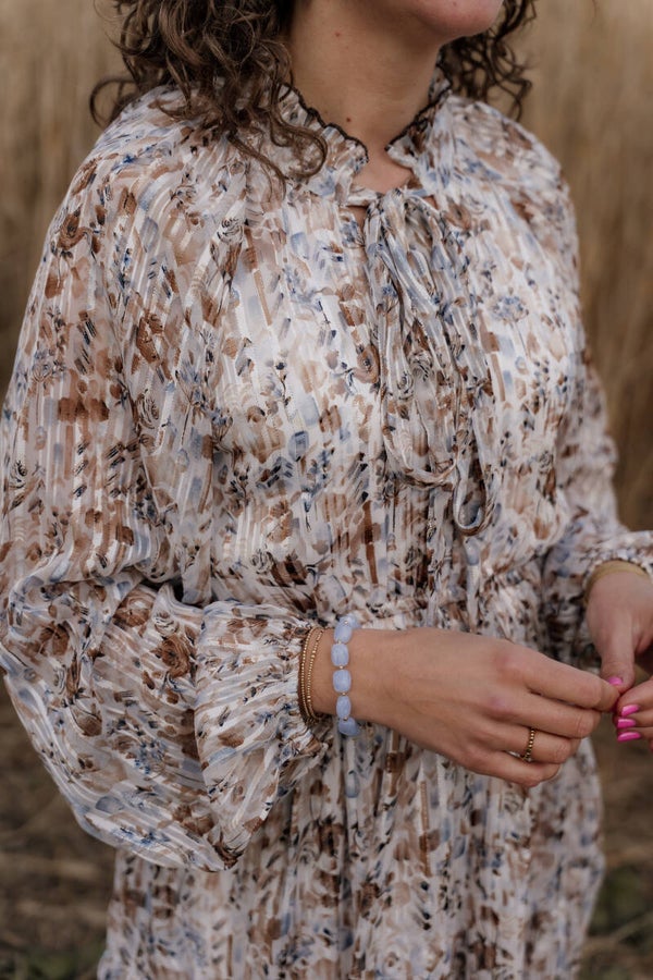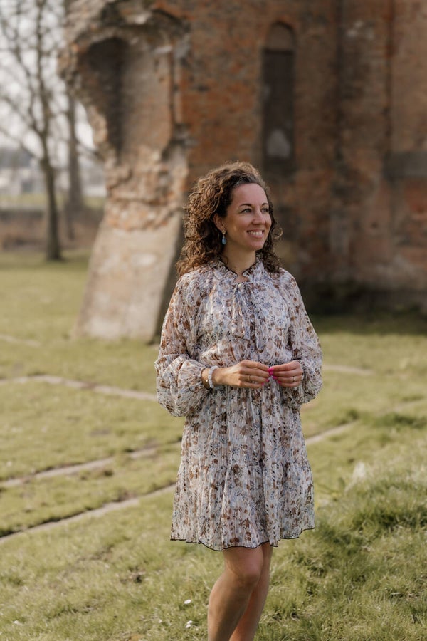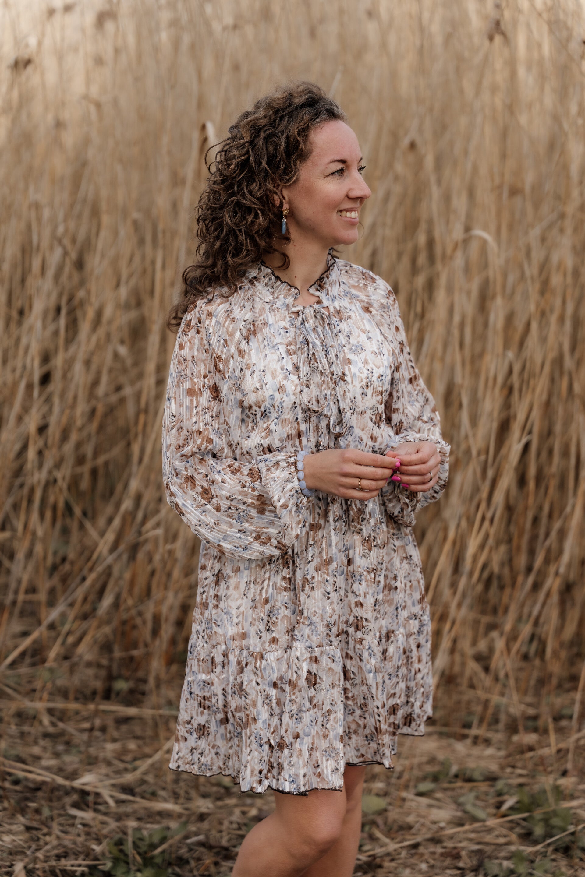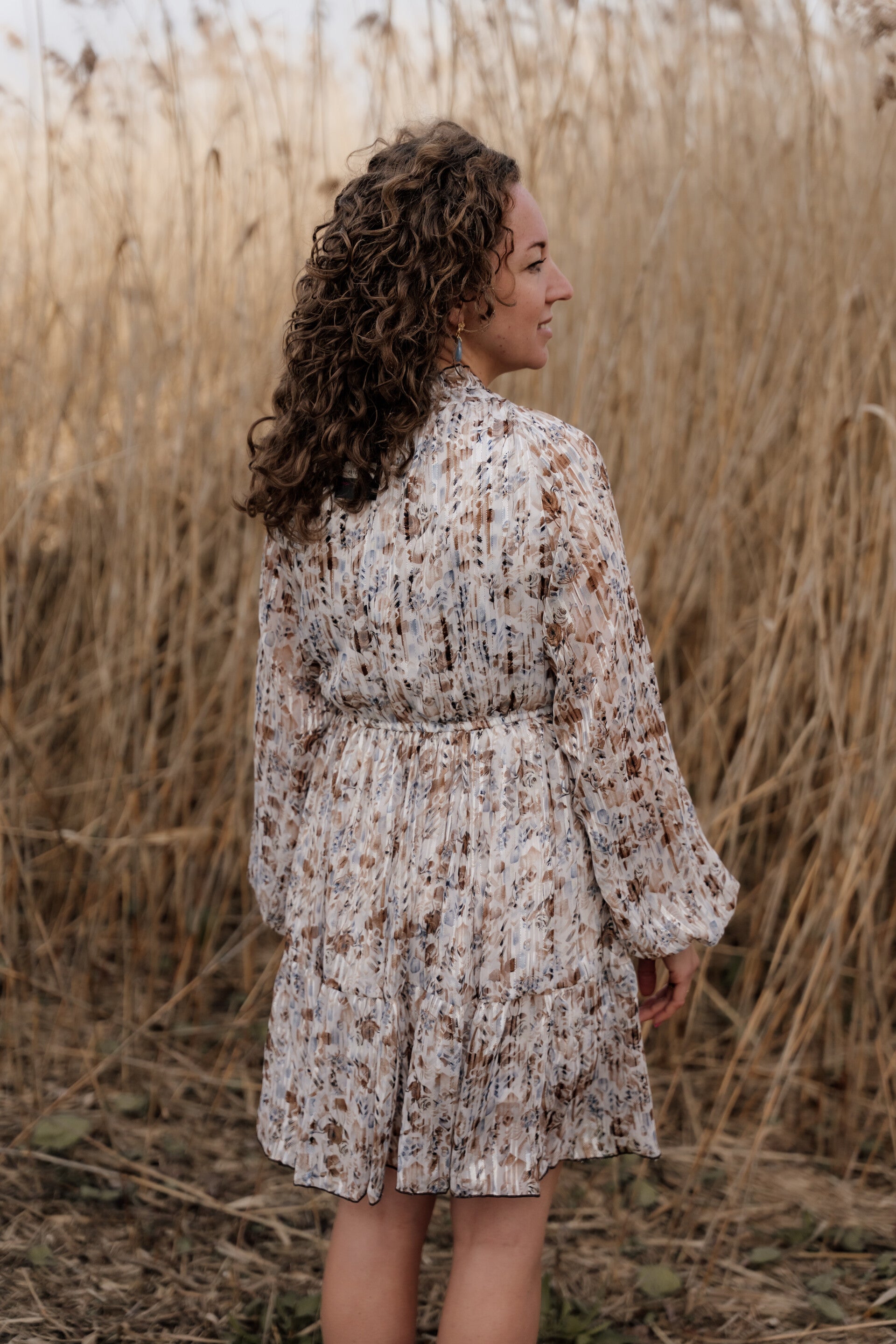 Deze stijlvolle jurk met zachte print heeft een vrouwelijke en speelse uitstraling. De jurk is mooi geplisseerd en heeft een elegante hals met strikdetail. Dankzij de voering draagt de jurk comfortabel en valt hij prachtig.