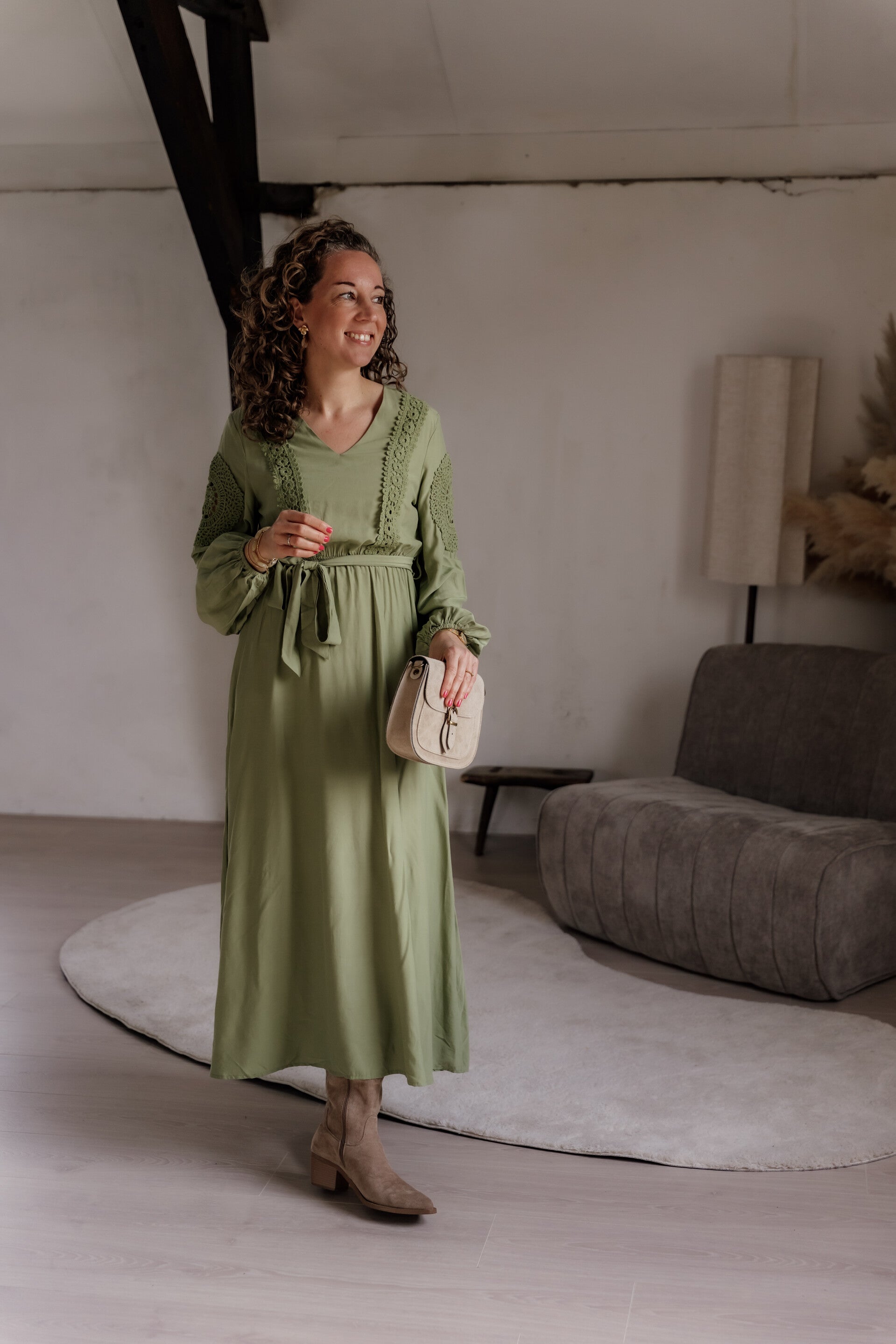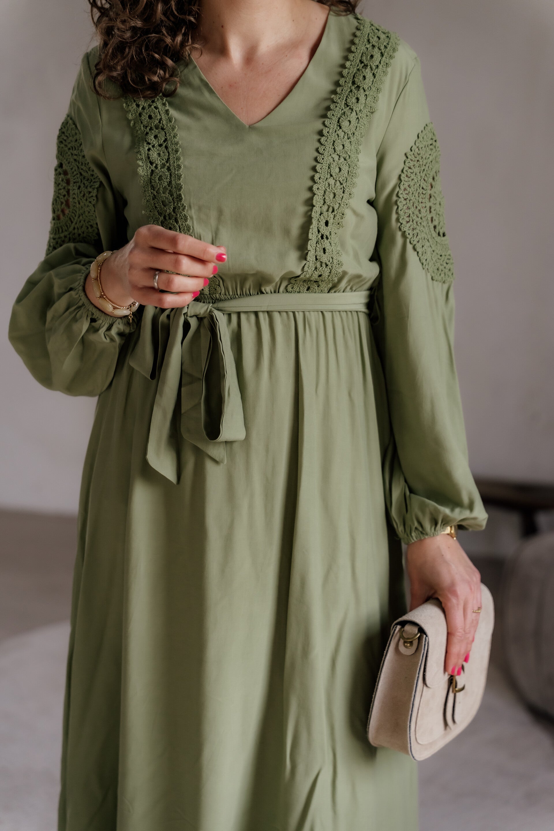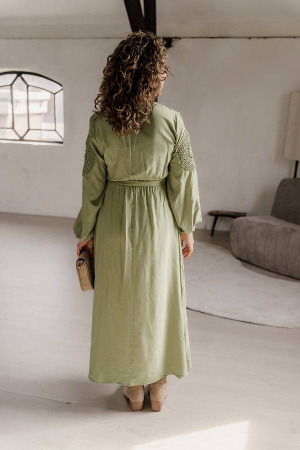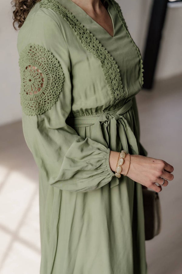Elegante midi jurk in een zachte groentint met een flatterende pasvorm. De V-hals, kanten accenten en elastische tailleband zorgen voor een vrouwelijke en verfijnde look. De lange mouwen met subtiele pof geven een moderne touch.