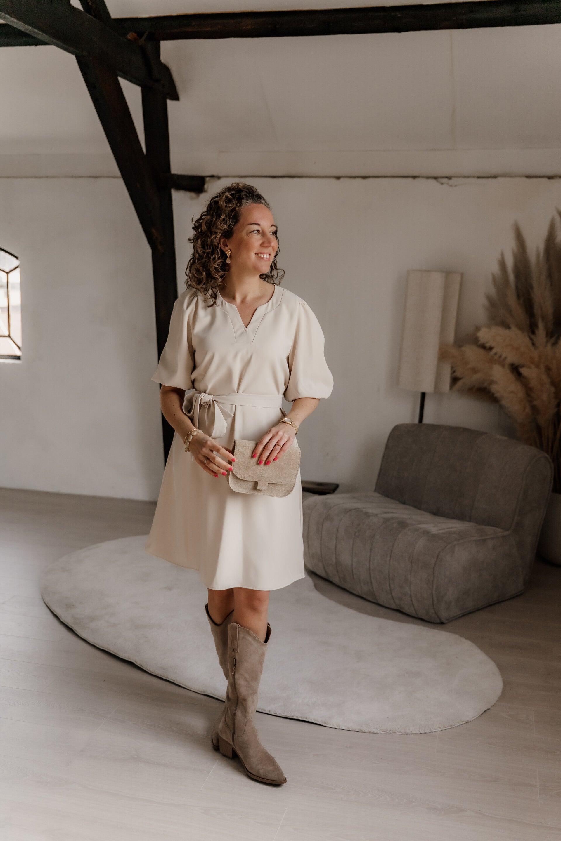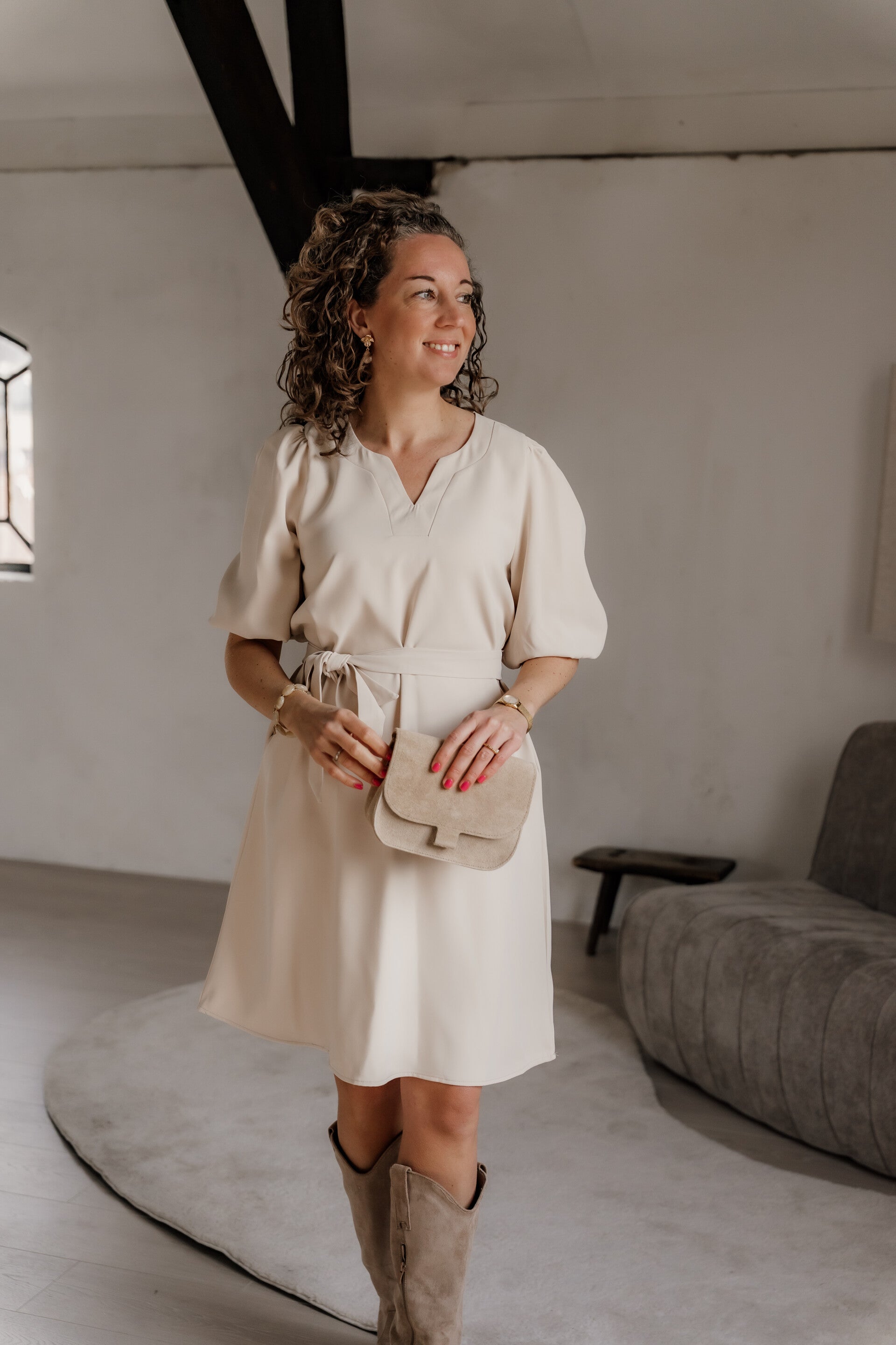 Deze jurk is voorzien van een elegante V-hals en subtiele pofmouwen voor een verfijnde look. De bijpassende ceintuur accentueert de taille, maar je kunt de jurk ook zonder ceintuur dragen voor een comfortabele, lossere pasvorm.