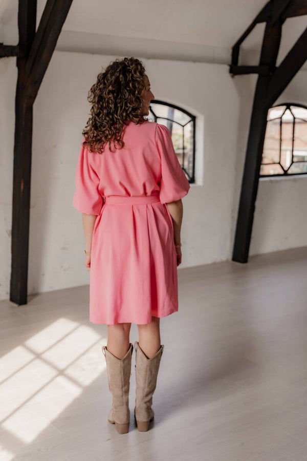 Deze jurk is voorzien van een elegante V-hals en subtiele pofmouwen voor een verfijnde look. De bijpassende ceintuur accentueert de taille, maar je kunt de jurk ook zonder ceintuur dragen voor een comfortabele, lossere pasvorm.