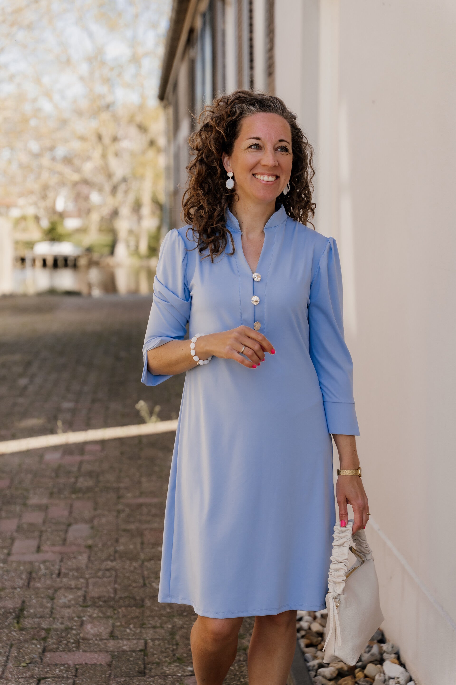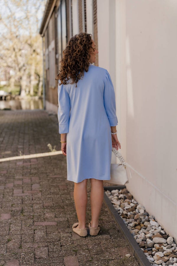 Lichtblauwe damesjurk met stijlvolle opstaande V-hals en elegante sierknopen aan de voorzijde. De soepelvallende stof zorgt voor een comfortabele pasvorm, terwijl de 3/4 mouwen met manchetten een chique uitstraling geven. De rechte, knielange snit maakt deze jurk perfect voor zowel zakelijke als casual gelegenheden. Tijdloos, vrouwelijk en makkelijk te combineren.