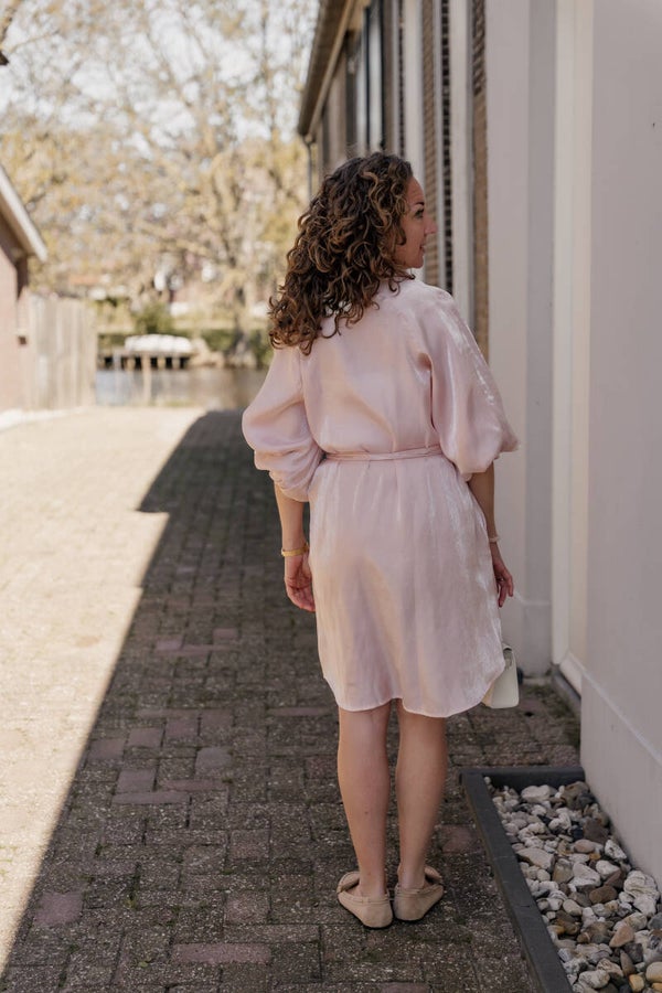 Een elegante jurk met een subtiele lichtroze glans. De luchtige, soepelvallende stof geeft een luxe uitstraling, terwijl de 3/4 pofmouwen zorgen voor een speelse en vrouwelijke touch. Met het ceintuur in de taille creëer je eenvoudig een mooi, flatterend silhouet.