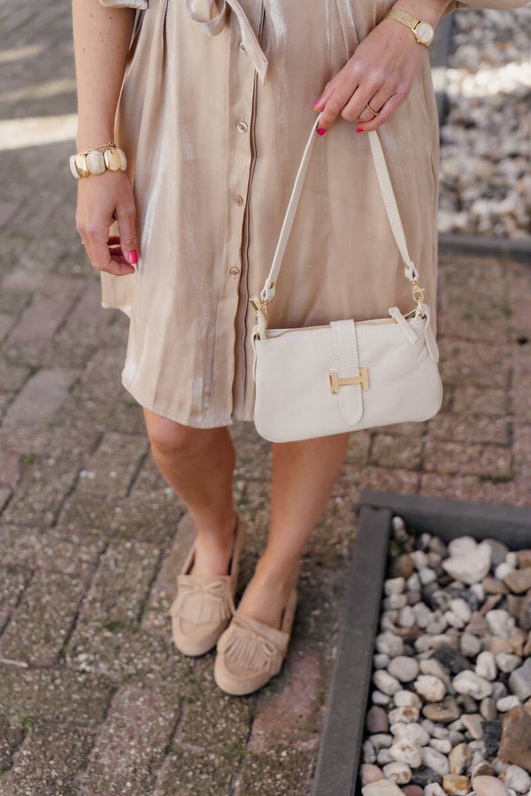 Een elegante jurk met een subtiele gouden glans. De luchtige, soepelvallende stof geeft een luxe uitstraling, terwijl de 3/4 pofmouwen zorgen voor een speelse en vrouwelijke touch. Met het ceintuur in de taille creëer je eenvoudig een mooi, flatterend silhouet.