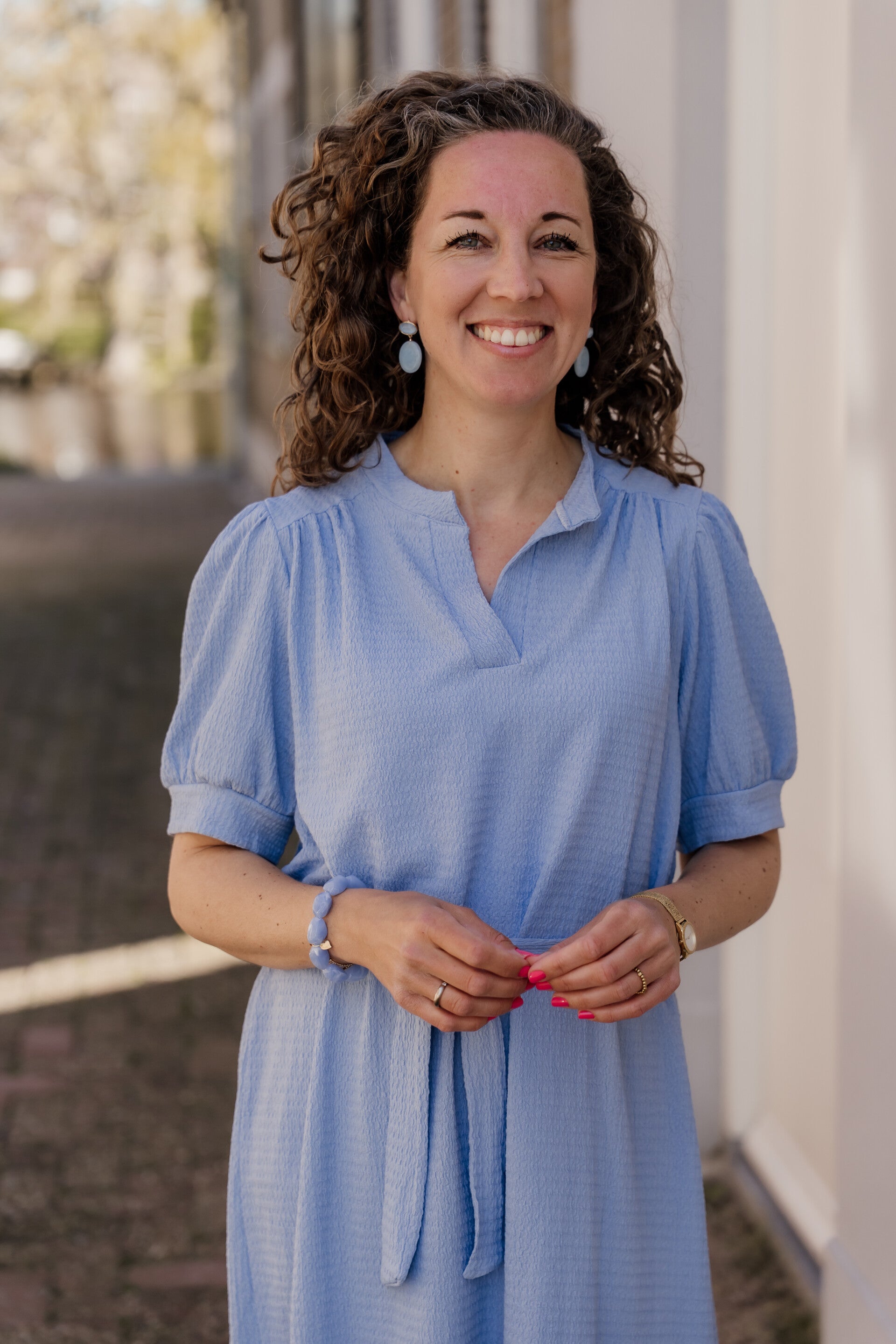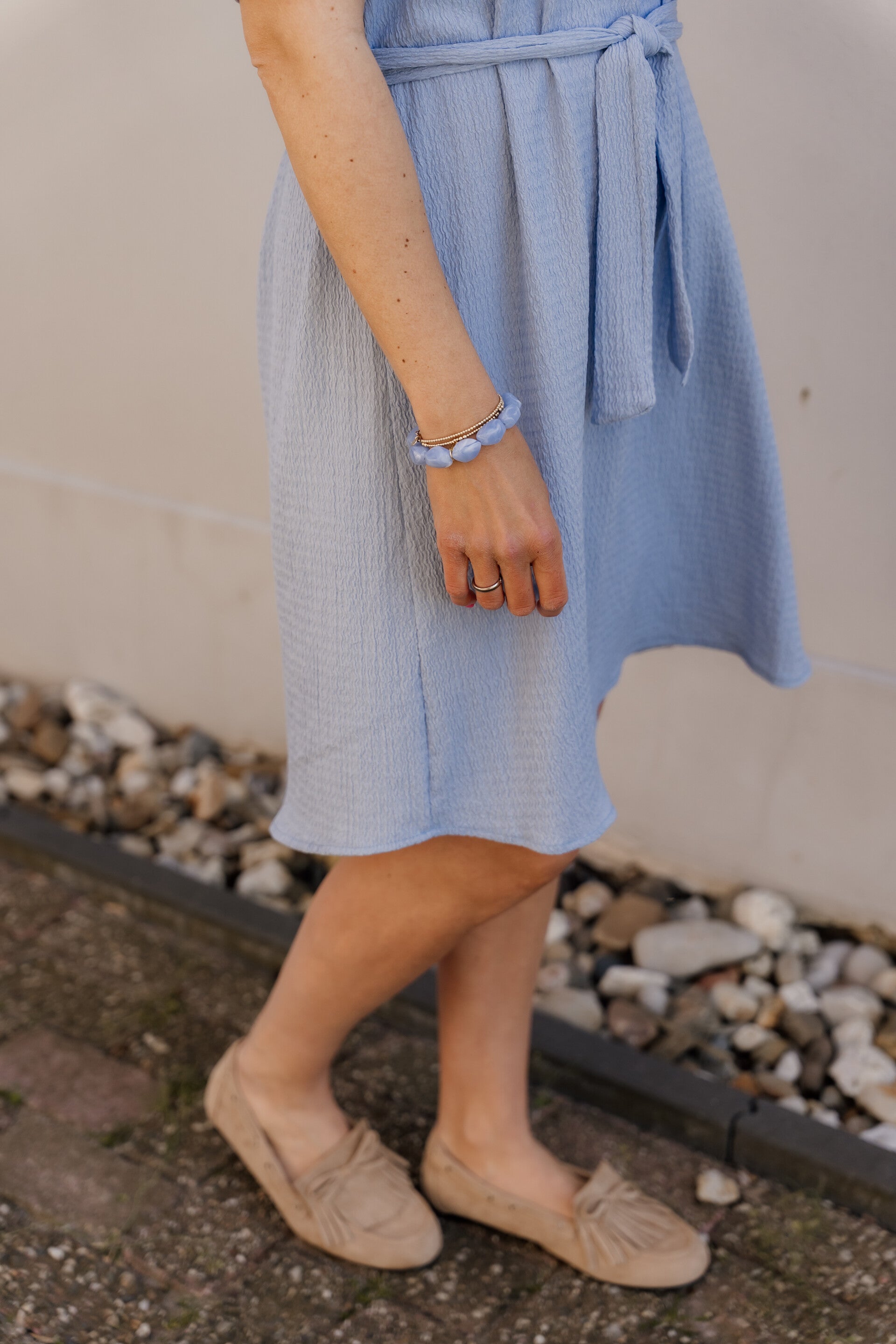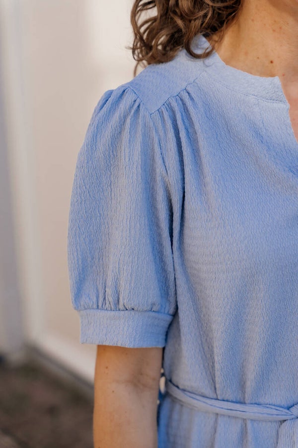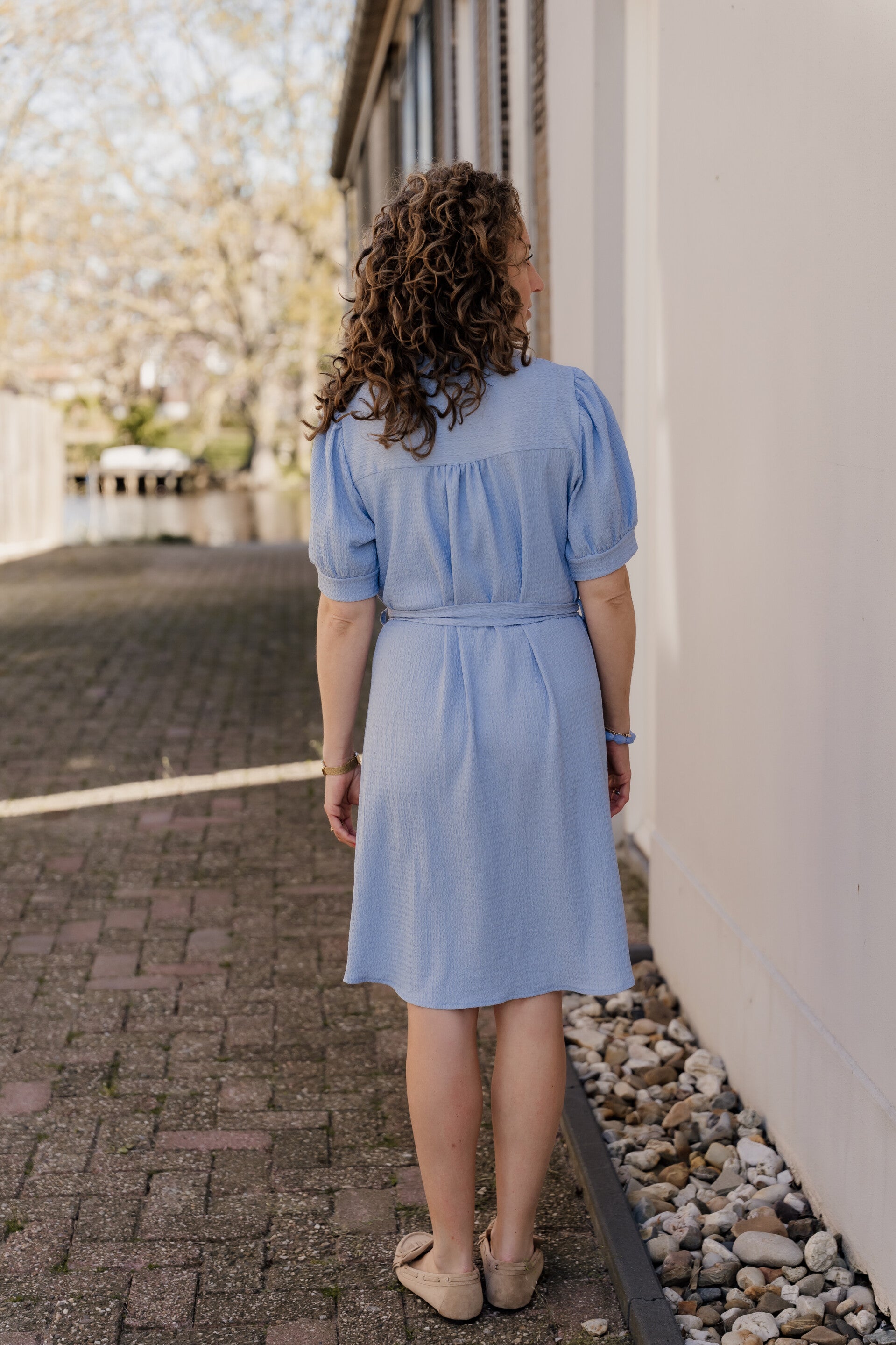 Lichtblauwe damesjurk met elegante V-hals en korte pofmouwen. Gemaakt van een luchtige, soepelvallende stof met subtiele structuur voor een comfortabele en stijlvolle look. De strikceintuur accentueert de taille, terwijl de knielange pasvorm zorgt voor een tijdloze uitstraling. Perfect voor zowel casual als feestelijke gelegenheden.